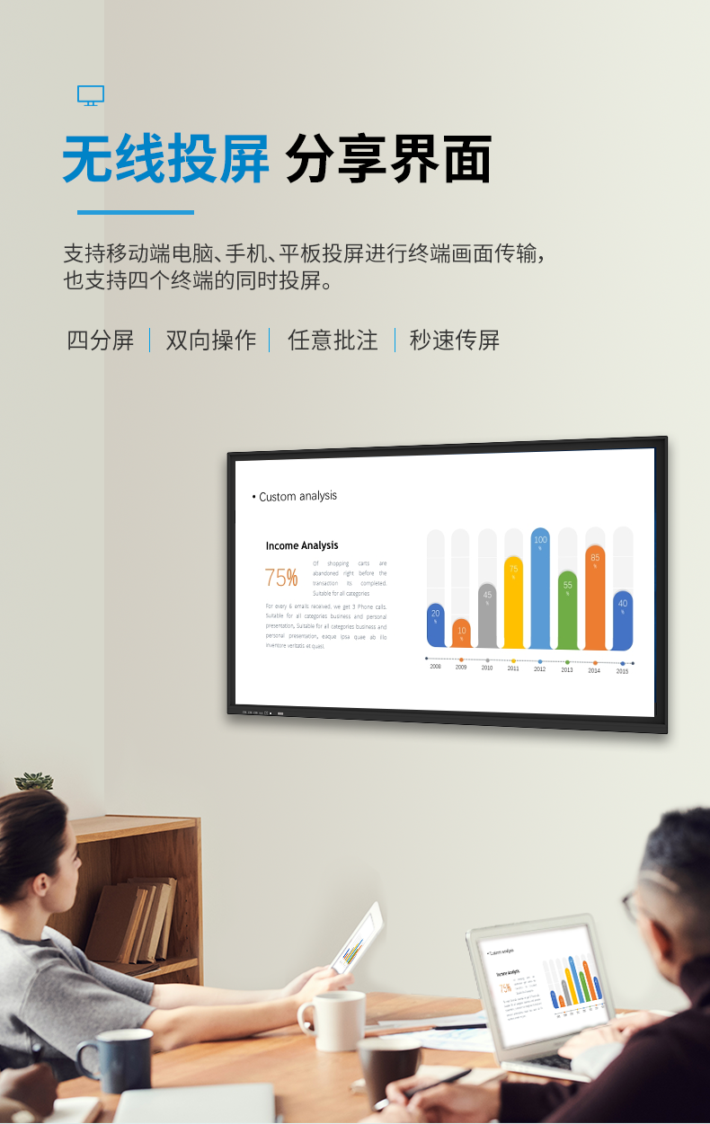 菜單產(chǎn)品中心Product center 液晶廣告機 壁掛式廣告機 落地立式廣告機 電梯超薄廣告機 車(chē)載廣告機 高亮廣告機 戶(hù)外廣告機 液晶拼接屏 專(zhuān)業(yè)液晶拼接屏 4K液晶拼接屏 廣告拼接屏 無(wú)縫液晶拼接屏 觸摸液晶拼接屏 LED顯示屏 觸控一體機 壁掛式觸控一體機 立式觸控一體機 斜面觸控一體機 智能家居觸控一體機 戶(hù)外觸控一體機 液晶電子白板 教育電子白板 會(huì )議電子白板 工控一體機 觸摸顯示器 紅外觸摸顯示器 電容觸摸顯示器 電阻觸摸顯示器 聲波觸摸顯示器 納米觸摸顯示器 液晶監視器 專(zhuān)業(yè)級監視器 4K監視器 嵌入式監視器 機架式監視器 開(kāi)放式監視器 SDI監視器 高亮監視器 廣播級監視器 工業(yè)顯示器 4K顯示器 機架式顯示器 開(kāi)放式顯示器 醫療顯示器 KVM顯示器 指揮室顯示器 智慧校園產(chǎn)品 專(zhuān)業(yè)定制商顯 多屏廣告機 多功能觸控一體機 多功能廣告機 微信打印廣告機 魔鏡廣告機 透明廣告機 全息廣告機 條形屏廣告機 旋轉廣告機 裸眼3D廣告機 人工智能產(chǎn)品 顯示配套設備 拼接配套設備 廣告機播放盒 OPS播放盒 拼接支架 移動(dòng)支架 相關(guān)軟件 吊頂支架 線(xiàn)材 木架 蜂窩箱 桌面底座 熱門(mén)產(chǎn)品 →優(yōu)色3.5mm超窄邊46寸液晶拼接屏→優(yōu)色49寸3.5mm超窄邊液晶拼接屏→優(yōu)色3.5mm超窄邊55寸液晶拼接屏 您的位置:首頁(yè) → 公司產(chǎn)品 → 液晶電子白板 → 會(huì )議電子白板 T系列電子白板類(lèi)別:會(huì )議電子白板 簡(jiǎn)介: 在線(xiàn)咨詢(xún) 返回列表 產(chǎn)品說(shuō)明 相關(guān)產(chǎn)品 43寸液晶電子白板 T系列電子白板 U系列電子白板 E系列電子白板 E系列電子白板