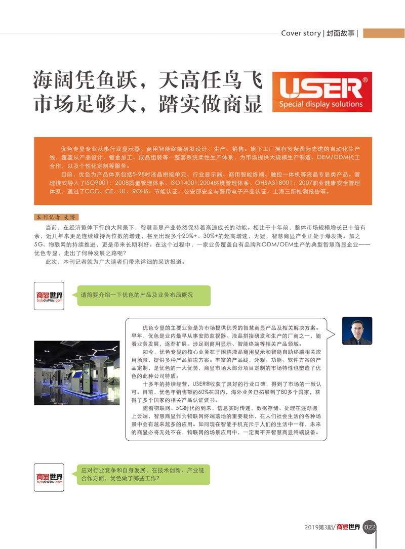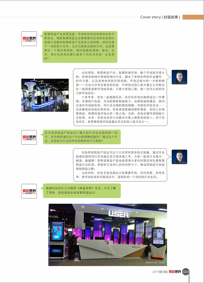 近日優(yōu)色專(zhuān)顯接受商顯世界專(zhuān)訪(fǎng),在此次采訪(fǎng)中優(yōu)色總經(jīng)理劉峰認真分析未來(lái)智慧商顯行業(yè)發(fā)展趨勢,講述優(yōu)色專(zhuān)顯自身的產(chǎn)品及業(yè)務(wù)布局概況,隨著(zhù)高速5G和萬(wàn)物互聯(lián)時(shí)代的到來(lái),信息實(shí)時(shí)傳遞,數據存儲、智能云端,智慧商顯作為物聯(lián)網(wǎng)終端的重要載體,在人類(lèi)生活的各種場(chǎng)景中會(huì )得到廣泛應用。 優(yōu)色專(zhuān)顯本次專(zhuān)訪(fǎng)刊登在商顯世界2019年第03期,以下是專(zhuān)訪(fǎng)的詳細內容與大家一起分享: