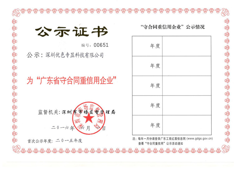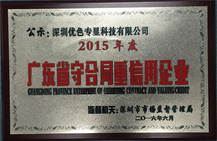 近日,廣東省工商行政管理局公示了2015年度省內“守合同重信用”企業(yè),深圳優(yōu)色專(zhuān)顯科技有限公司首次上榜,獲此殊榮,意味著(zhù)社會(huì )各界對優(yōu)色專(zhuān)顯在誠信經(jīng)營(yíng)、企業(yè)信用體系建設、維護合同信用等方面給予的充分肯定和高度評價(jià)。