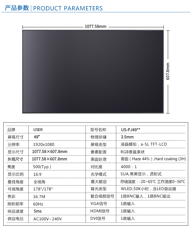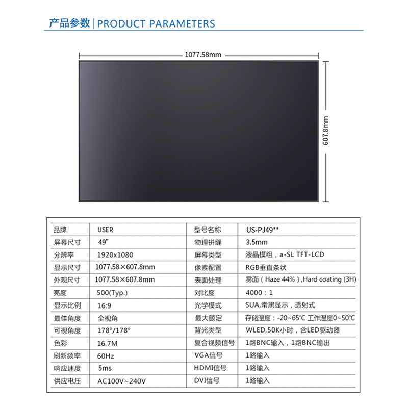 菜單產(chǎn)品中心Product center 液晶廣告機 壁掛式廣告機 落地立式廣告機 電梯超薄廣告機 車(chē)載廣告機 高亮廣告機 戶(hù)外廣告機 液晶拼接屏 專(zhuān)業(yè)液晶拼接屏 4K液晶拼接屏 廣告拼接屏 無(wú)縫液晶拼接屏 觸摸液晶拼接屏 LED顯示屏 觸控一體機 壁掛式觸控一體機 立式觸控一體機 斜面觸控一體機 智能家居觸控一體機 戶(hù)外觸控一體機 液晶電子白板 教育電子白板 會(huì )議電子白板 工控一體機 觸摸顯示器 紅外觸摸顯示器 電容觸摸顯示器 電阻觸摸顯示器 聲波觸摸顯示器 納米觸摸顯示器 液晶監視器 專(zhuān)業(yè)級監視器 4K監視器 嵌入式監視器 機架式監視器 開(kāi)放式監視器 SDI監視器 高亮監視器 廣播級監視器 工業(yè)顯示器 4K顯示器 機架式顯示器 開(kāi)放式顯示器 醫療顯示器 KVM顯示器 指揮室顯示器 智慧校園產(chǎn)品 專(zhuān)業(yè)定制商顯 多屏廣告機 多功能觸控一體機 多功能廣告機 微信打印廣告機 魔鏡廣告機 透明廣告機 全息廣告機 條形屏廣告機 旋轉廣告機 裸眼3D廣告機 人工智能產(chǎn)品 顯示配套設備 拼接配套設備 廣告機播放盒 OPS播放盒 拼接支架 移動(dòng)支架 相關(guān)軟件 吊頂支架 線(xiàn)材 木架 蜂窩箱 桌面底座 熱門(mén)產(chǎn)品 →優(yōu)色3.5mm超窄邊46寸液晶拼接屏→優(yōu)色49寸3.5mm超窄邊液晶拼接屏→優(yōu)色3.5mm超窄邊55寸液晶拼接屏 您的位置:首頁(yè) → 公司產(chǎn)品 → 液晶拼接屏 → 專(zhuān)業(yè)液晶拼接屏 優(yōu)色49寸3.5mm超窄邊液晶拼接屏類(lèi)別:專(zhuān)業(yè)液晶拼接屏 簡(jiǎn)介:◆ 型號:US-PJ49** ◆類(lèi)型:三星/LG/京東方BOE面板 ◆亮度:500-700cd/m2(可選) ◆超窄邊設計,拼縫3.5mm ◆ 在ISO9001嚴格的質(zhì)量控制體系下生產(chǎn)? ◆ 色彩均勻,圖像穩定,為拼接大畫(huà)面定制... 在線(xiàn)咨詢(xún) 返回列表 產(chǎn)品說(shuō)明 相關(guān)產(chǎn)品 優(yōu)色1.7mm超窄邊55寸液晶拼接屏 優(yōu)色49寸1.8mm超窄邊液晶拼接墻 優(yōu)色49寸3.5mm超窄邊液晶拼接屏 優(yōu)色3.5mm超窄邊55寸液晶拼接屏 優(yōu)色3.5mm超窄邊46寸液晶拼接屏 優(yōu)色5.3mm超窄邊55寸液晶拼接屏