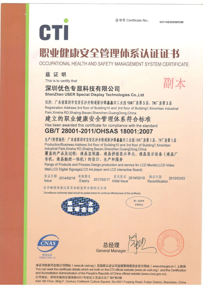 OHSAS18001:2007職業(yè)健康安全管理體系證書(shū)