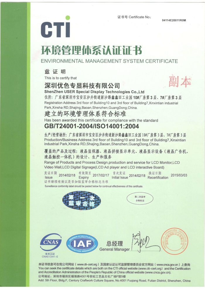 ISO14001:2004環(huán)境管理體系證書(shū)